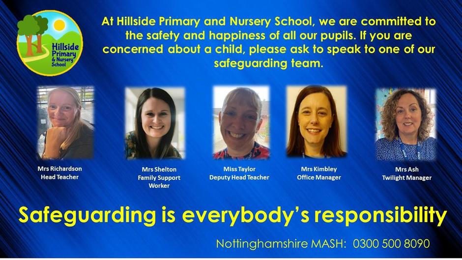 Safeguarding our pupils is paramount at Hillside Primary and Nursery School. Our aim is that all pupils feel safe and secure, in a caring place where they feel valued. We put children at the centre, listen and hear what they say. Every individual within our school aims to provide a safe environment and vigilant culture. They will play their part, including working with professionals from other agencies, to meet the needs of our most vulnerable children and keep them safe. If there are safeguarding concerns we will respond, with appropriate action, in a timely manner.
